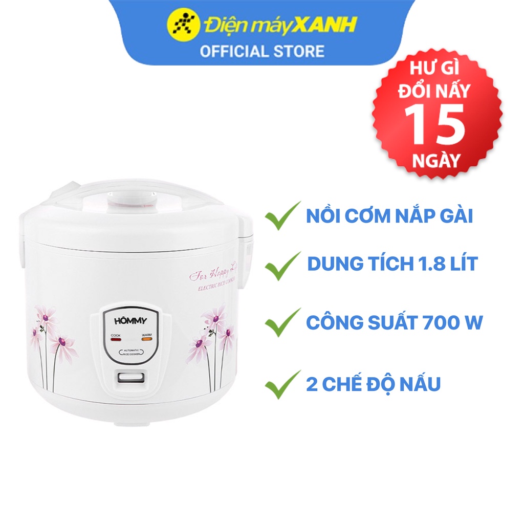 Thiết Bị Điện Gia Dụng > Đồ gia dụng nhà bếp > Nồi cơm điện || Nồi cơm điện nắp gài Hommy JRC-180F 1.8 lít 700 W lòng nồi chống dính - Chính hãng BH 12 thángCòn hàng