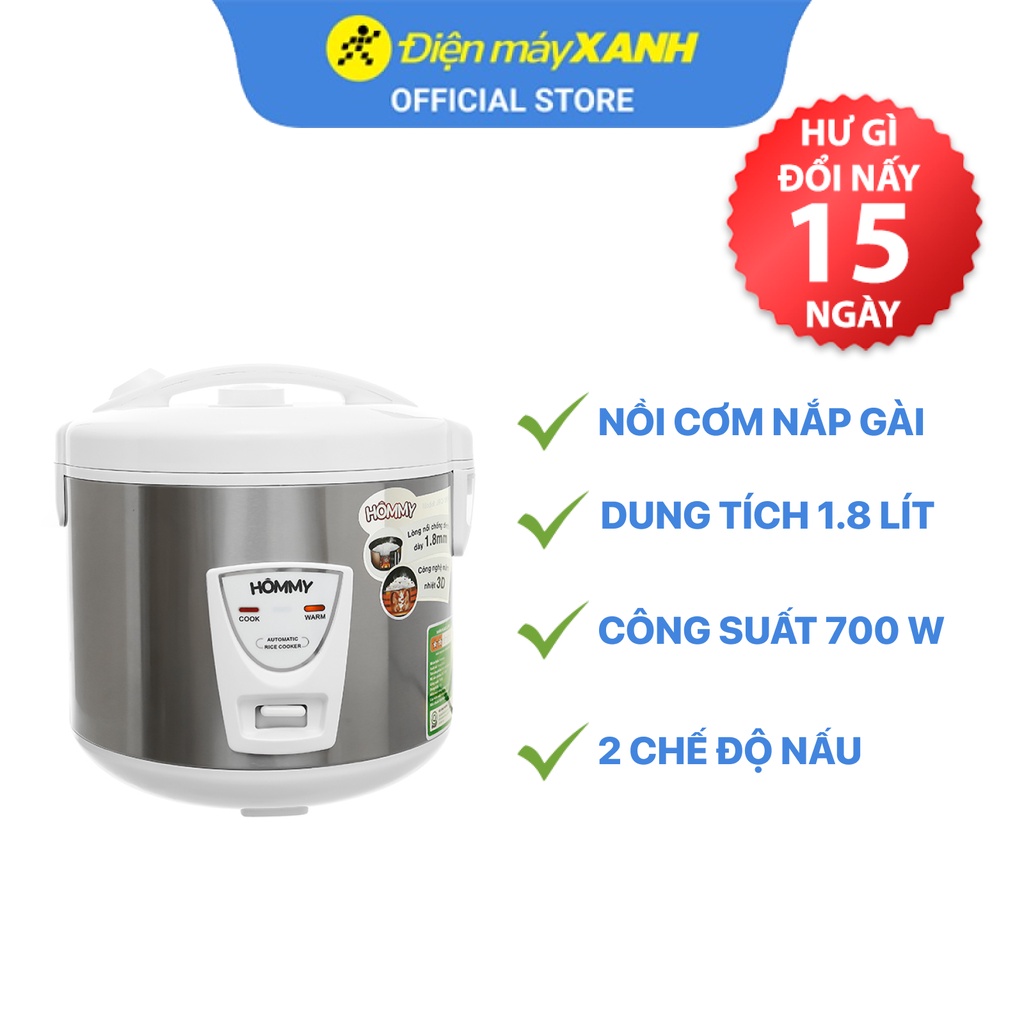 Thiết Bị Điện Gia Dụng > Đồ gia dụng nhà bếp > Nồi cơm điện || Nồi cơm điện nắp gài Hommy JRC-180K 1.8 lít 700 W công nghệ nấu 3D - Chính hãng BH 12 thángCòn hàng