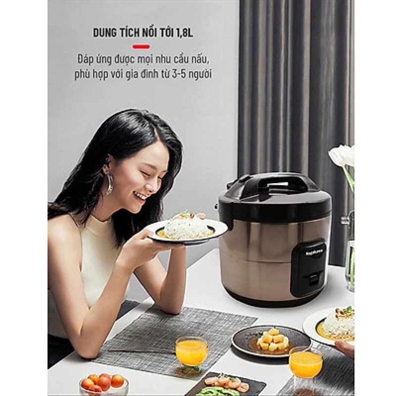 Thiết kế lòng nồi dạng niêu đất tạo dòng sôi tuần hoàn, giúp cơm chín đều và ngon hơn. Dung tích nồi tới 1,8L đáp ứng được mọi nhu cầu nấu, phù hợp với gia đình từ 3-5 người