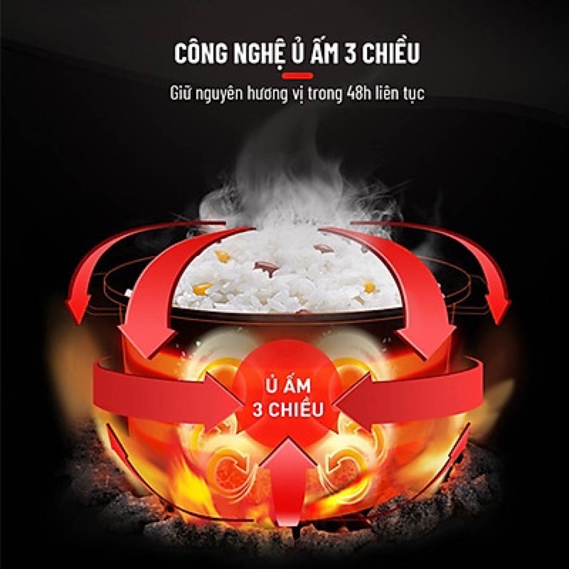 Công nghệ ủ ấm 3 chiều giữ nguyên hương vị trong 48h Lòng nồi sử dụng vật liệu nhôm nguyên chất An toàn sức khỏe với chống dính Ceramic đa lớp Thiết kế lòng nồi dạng niêu đất tạo dòng sôi tuần hoàn, giúp cơm chín đều và ngon hơn Kết cấu nắp vung kép giúp giữ hơi tốt và dễ dàng vệ sinh Mâm nhiệt lớn, tỏa nhiệt đều giúp cơm chín nhanh hơn Mặt điều khiến cơ dễ sử dụng Kiểu dáng sang trọng, chất liệu bền và an toànThiết kế tinh tế sang trọng