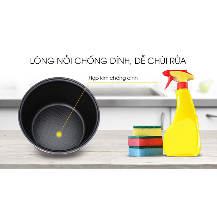 Nồi cơm điện có cấu tạo lòng nồi đặc biệt, được phủ một lớp chống dính Flon đen cao cấp, sức nóng được dàn đều giúp nấu chín cơm và không bị cháy khét. Sau khi sử dụng bạn cũng có thể dễ dàng chùi rửa sạch sẽ để bảo quản tốt hơn.