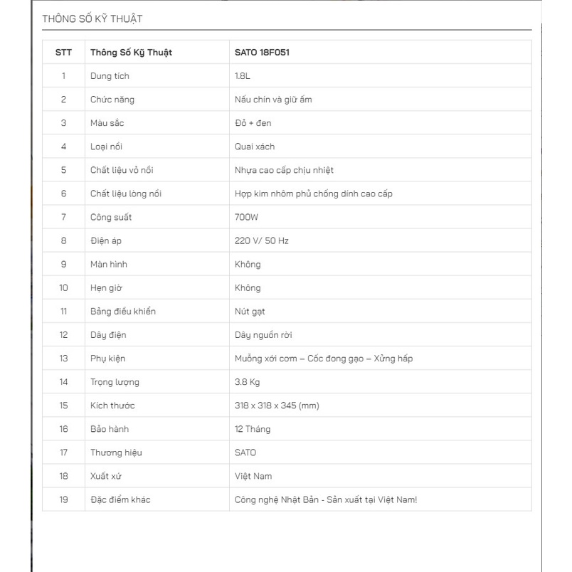 - Nồi cơm điện SATO 18F051 được thiết kế và sản xuất tại Việt Nam bởi đội ngũ nhân viên, kỹ thuật viên có tay nghề và trình độ cao của SATO. SATO được biết đến là một trong những thương hiệu gia dụng hàng đầu Việt Nam với bề dày kinh nghiệm hơn 20 năm trong lĩnh vực sản xuất và phân phối các mặt hàng gia dụng trên toàn quốc. Thương hiệu đã nhiều lần vinh dự nhận giải thưởng danh giá, nổi bật là giải thưởng “Hàng Việt Nam chất lượng cao” đã trải qua rất nhiều đợt xét duyệt nghiêm ngặt, được người tiêu dùng và Hội đồng thẩm định đánh giá cao.