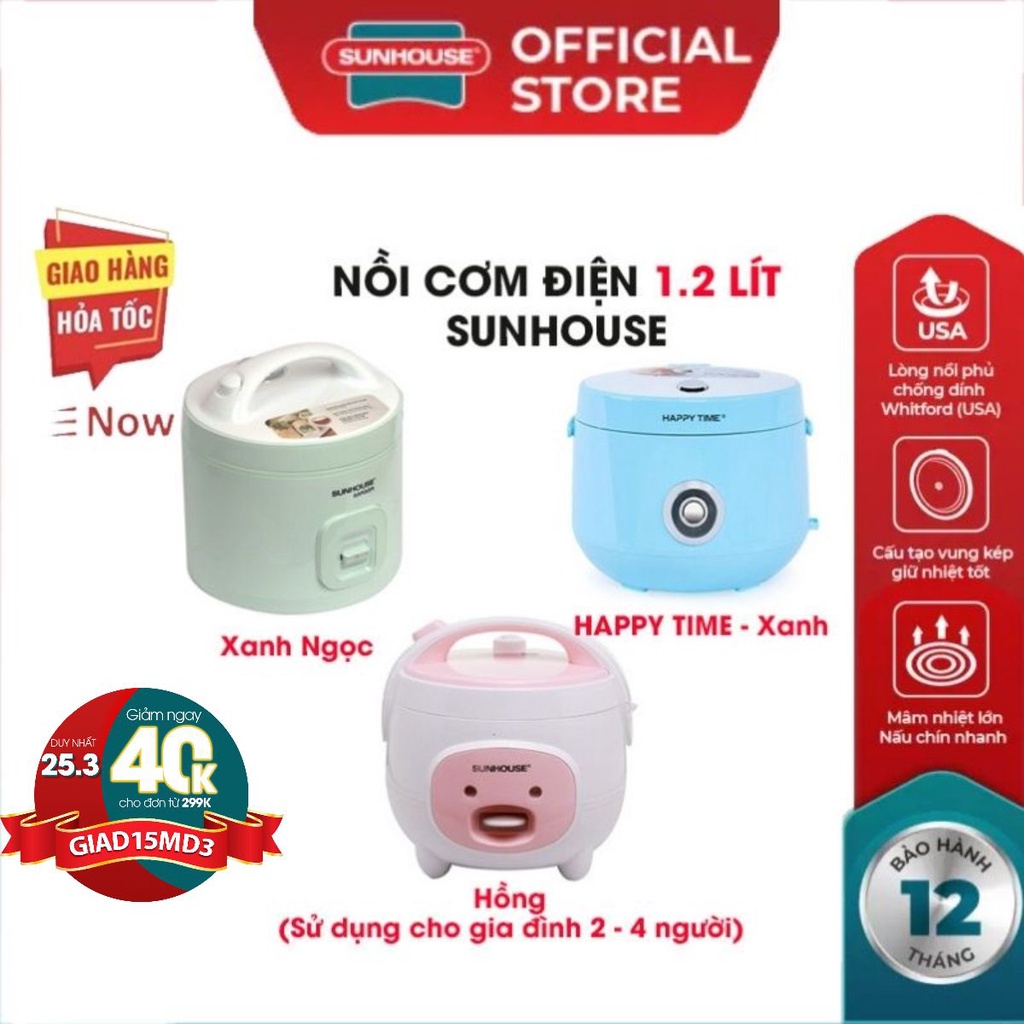 Thiết Bị Điện Gia Dụng > Đồ gia dụng nhà bếp > Nồi cơm điện || Nồi cơm điện SUNHOUSE Happytime 1.2 Lít có 3 màu lòng nồi chống dính siêu bền giữ nhiệt tốt nấu cơm nhanhCòn hàng