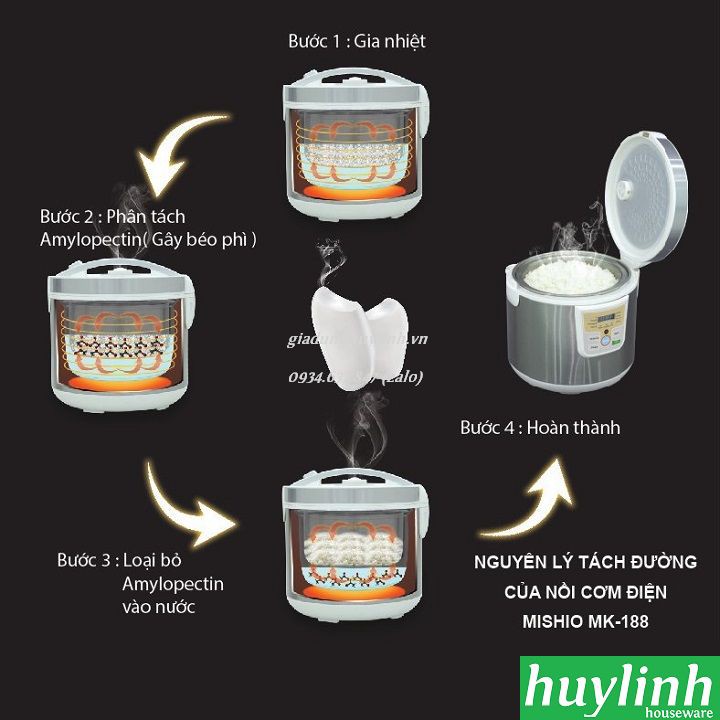 4 giai đoạn công nghệ nấu tách đường thông minh của Nồi cơm điện tách đường cao cấp Mishio MK-188: