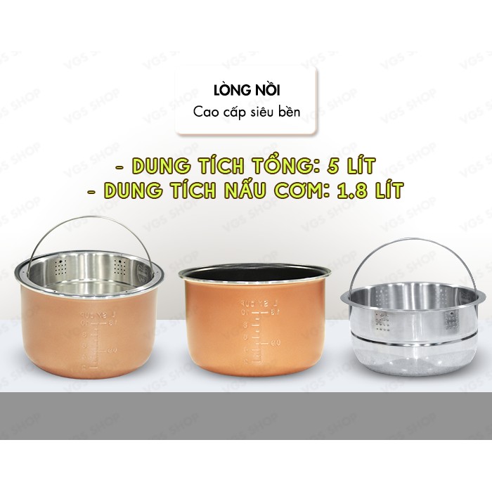 - Dung tích lớn 5L, công suất 800 W, nấu cơm nhanh chóng cho cả nhà