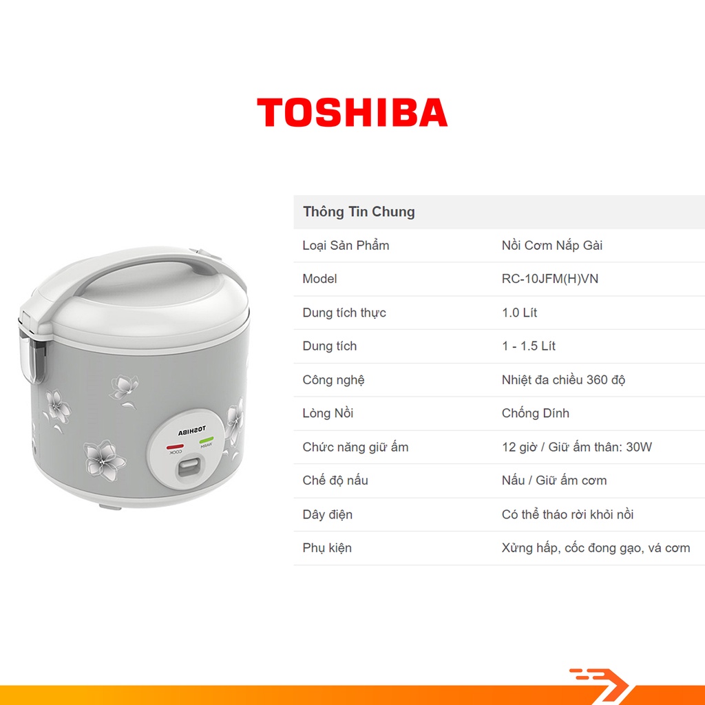 Nồi Cơm Điện Toshiba 1 Lít RC-10JFM(H)VN - Bảo Hành Chính Hãng- Dung tích: 1.0L