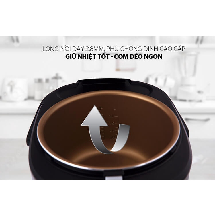 Bên trong lòng nồi có thang đo với các vạch mức rõ ràng giúp bạn tính toán và nấu đúng lượng gạo và lượng nước cho cơm chín ngon, đúng ý. Dung tích lên đến 1.8 lít phù hợp cho gia đình 4 – 6 thành viên.