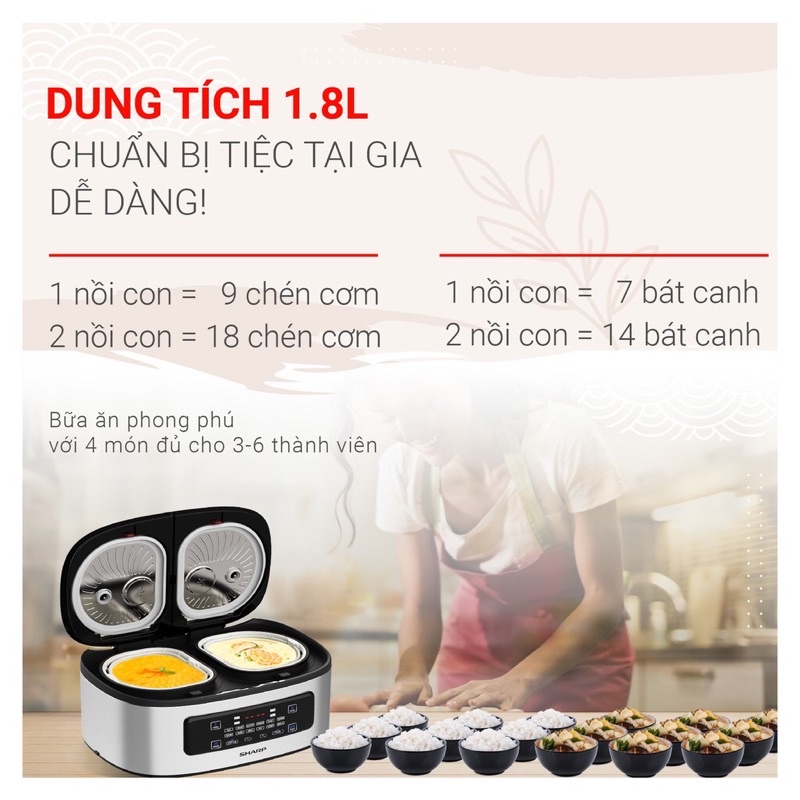 Nồi Cơm Điện Tử 2 Ngăn Sharp KN-TC50VN, 1.8lit - 900w, Nấu Đa Năng Cùng Lúc 2 Lòng Nồi, Hàng Chính Hãng