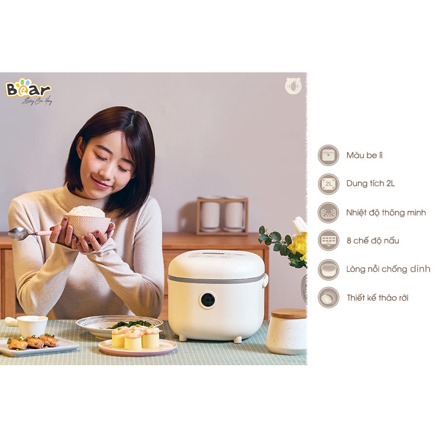 Nồi cơm điện Bear có dung tích 2000ml phù hợp nấu ăn cho gia đình nhỏ từ 2 - 4 người, nồi nhỏ xinh với công nghệ nấu hiện đại đảm bảo mang đến cho gia đình bạn những bữa cơm tơi ngon, xốp dẻo phù hợp với khẩu vị của cả người lớn và trẻ nhỏ.