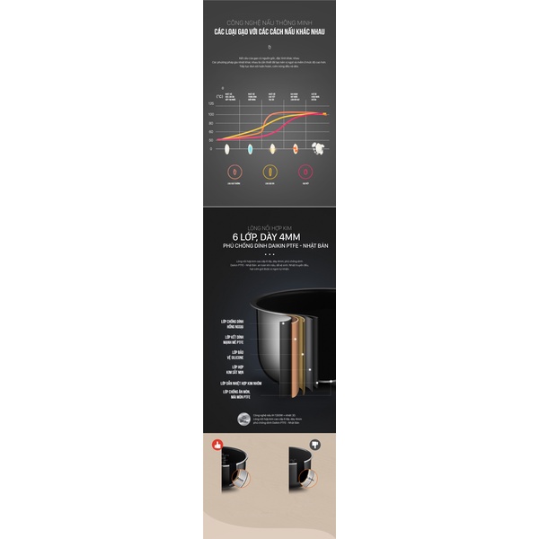 Lòng nồi 6 lớp dày 4mm bằng hợp kim nhôm sơn chống dính Daikin PTFE - Nhật Bản dẫn nhiệt nhanh, duy trì độ nóng, nâng cao hiệu quả nấu. Thiết kế lòng nồi dày giúp dẫn nhiệt hiệu quả và giữ nhiệt tốt, đem lại cho người dùng hương vị cơm nấu thơm ngon, mềm dẻo.
