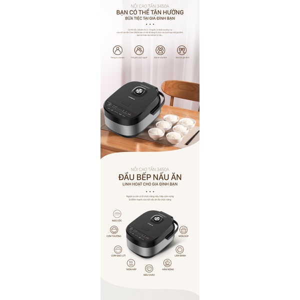 Ngoài chức năng chính là nấu cơm, sản phẩm còn có 8 chương trình nấu tự động đã được thiết lập sẵn. Thực đơn đa dạng: Nấu ngon/Nấu/Nhiều loại/Cơm niêu/Bánh/Hấp/Cháo/Súp/Giữ ấm.