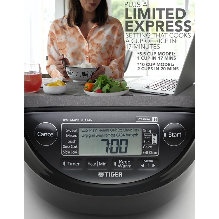 Nồi cơm điện tử cao tần Tiger JPM-H18V với chức năng nấu cơm siêu tốc “Exp. Limited Cups” công nghệ mới chỉ được tích hợp trên những nồi cơm điện tử cao cấp nấu chín 1 – 3 cốc gạo (2 – 6 chén cơm) trong vòng 17 – 26 phút khi bạn cần nấu thêm cơm nhanh khi thiếu cơm cho khẩu phần ăn hay bạn chỉ nấu cho một khẩu phần ăn giúp bạn tiết kiệm nhiều thời gian cho công việc nội trợ. Lưu ý : khi nấu cơm ở chế độ nấu cơm siêu tốc, cơm chín sẽ hơi cứng. (Bạn có thể điều chỉnh thời gian hấp để cơm mềm hơn theo sách hướng dẫn sử dụng tại trang 115)