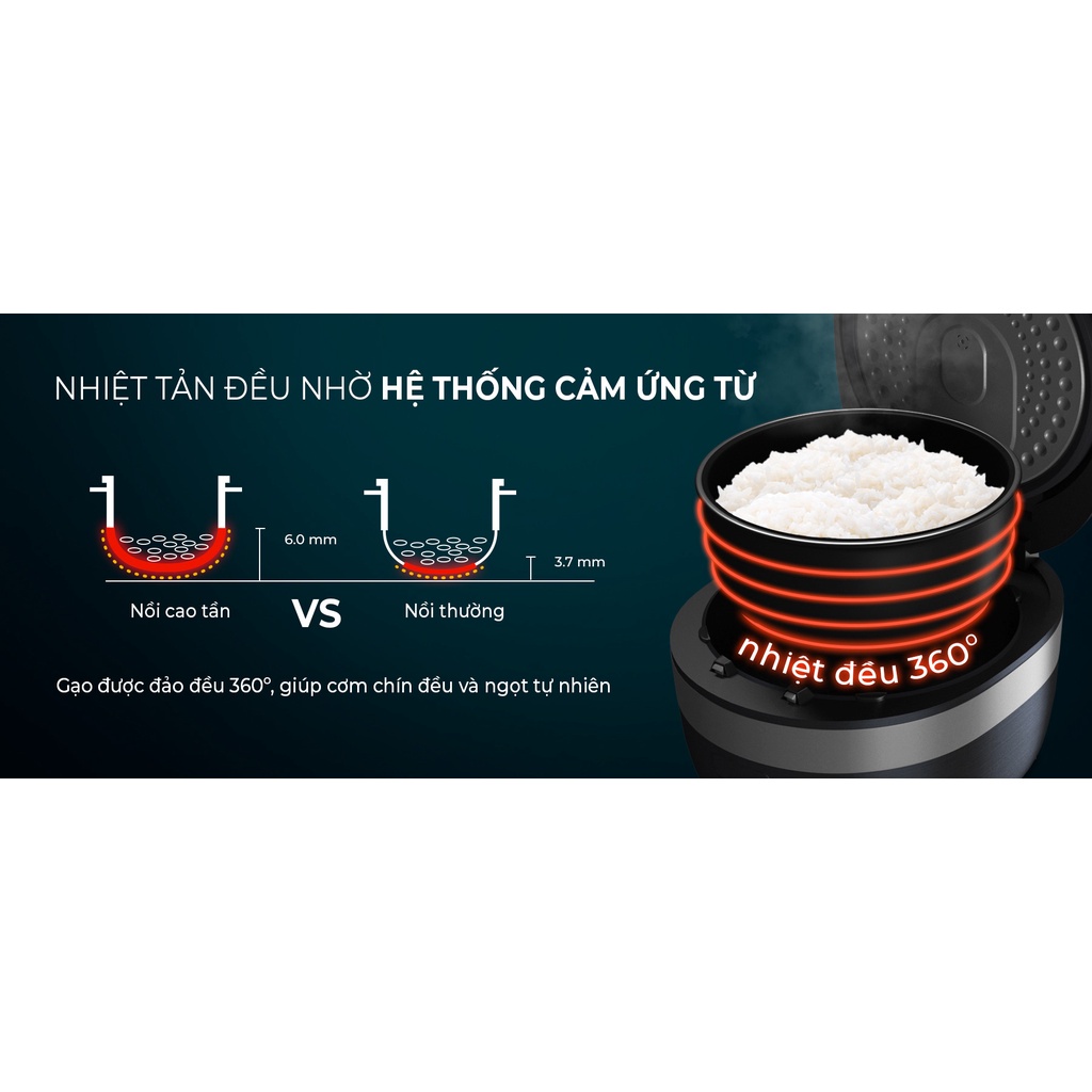 Nồi cơm điện tử cao tần ứng dụng cảm ứng từ cho khả năng cấp nhiệt mạnh mẽ và lan tỏa đều khắp lòng nồi. Thực phẩm theo đó được đảo đều 360 độ lúc đun đẩy nhanh quá trình chín mà vẫn giữ được độ mềm, ngọt của thực phẩm.