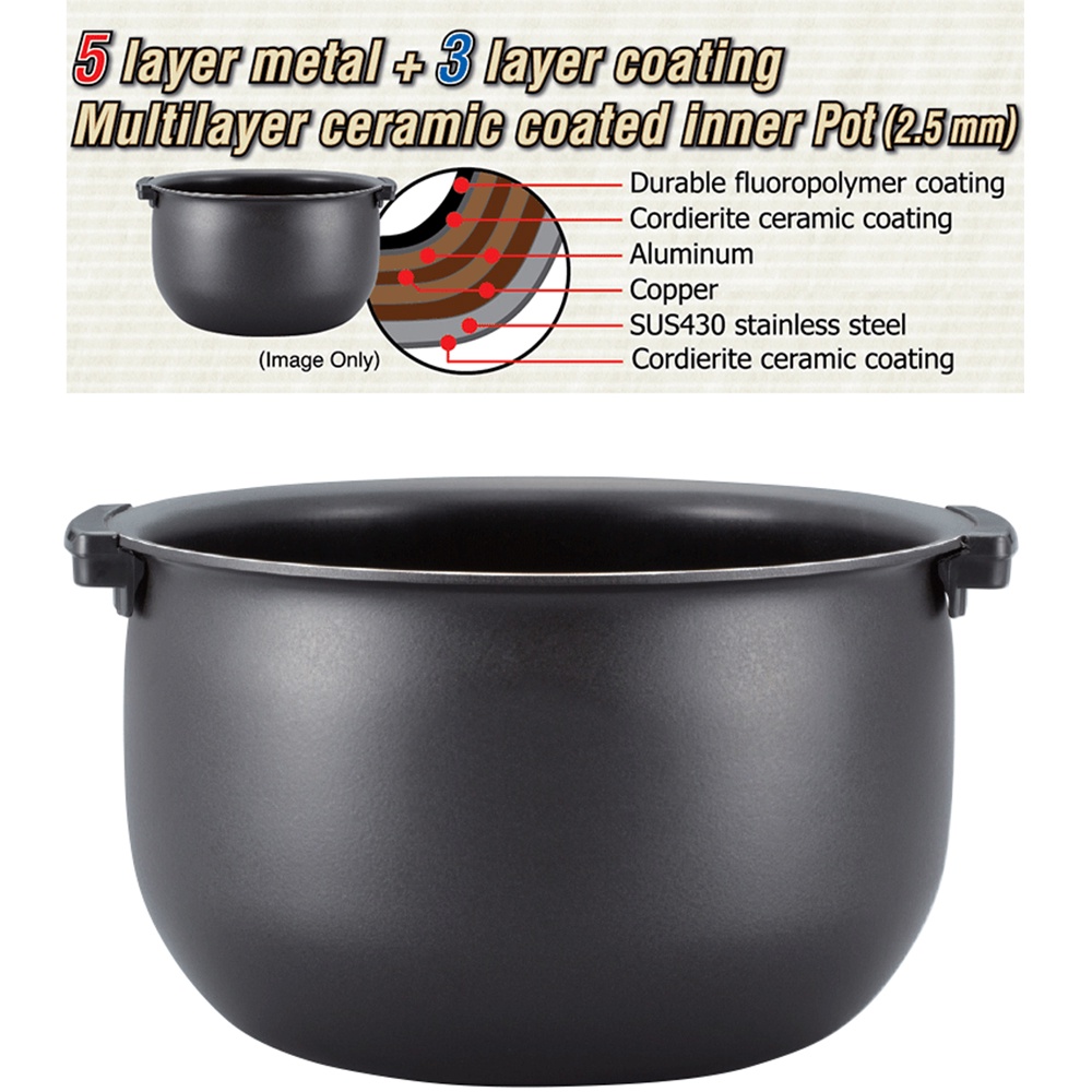 Lồng nồi cơm được làm bằng 5 lớp hợp kim nhôm và kim loại tinh khiết với công nghệ phủ 3 lớp men gốm “Cordierite Ceramic” chống dính bằng tia hồng ngoại dầy 2.5mm, không gây ra những chất độc hại cho sức khỏe, độ bền cao, hạn chế bám bẩn và dễ vệ sinh cũng như giữ cơm nóng lâu hơn.