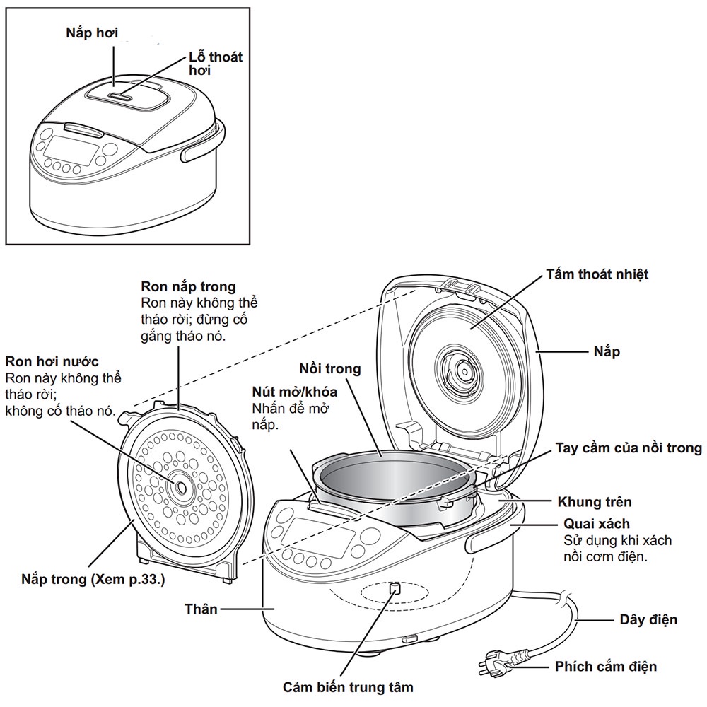 Nắp ngoài, nắp trong và nắp thoát hơi có thể tháo rời để vệ sinh.