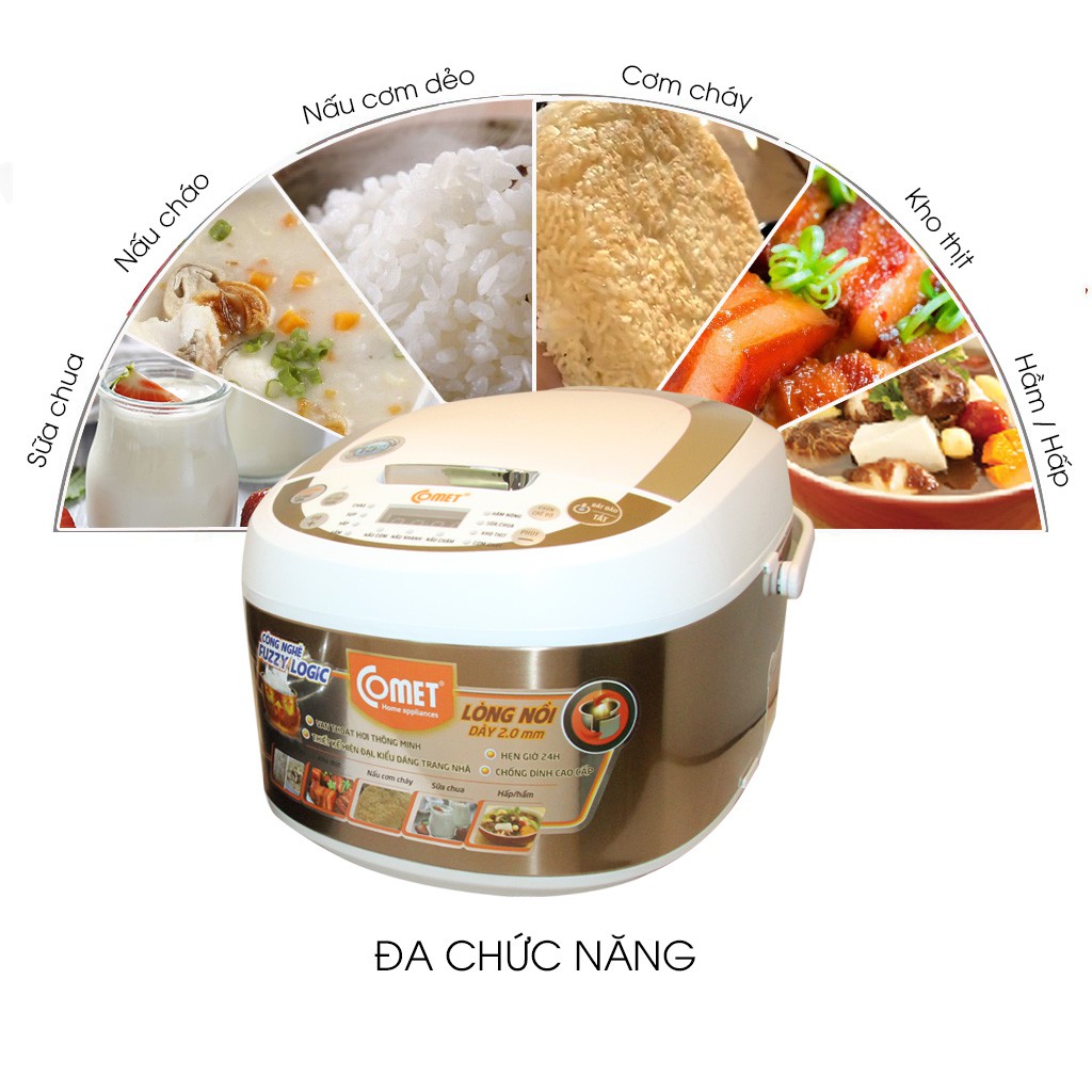 Nồi cơm điện Comet này được tích hợp nhiều chức năng tiện ích. Không những sản phẩm nấu cơm chín ngon mà nó còn có thể nấu cháo, kho thịt, nấu cơm cháy, làm sữa chua, hấp/hầm.