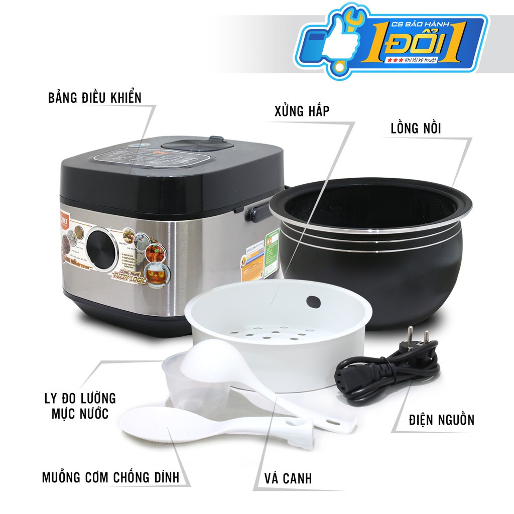 Phụ kiện đi kèm: xửng hấp, ly đong, muỗng cơm, muỗng canh.