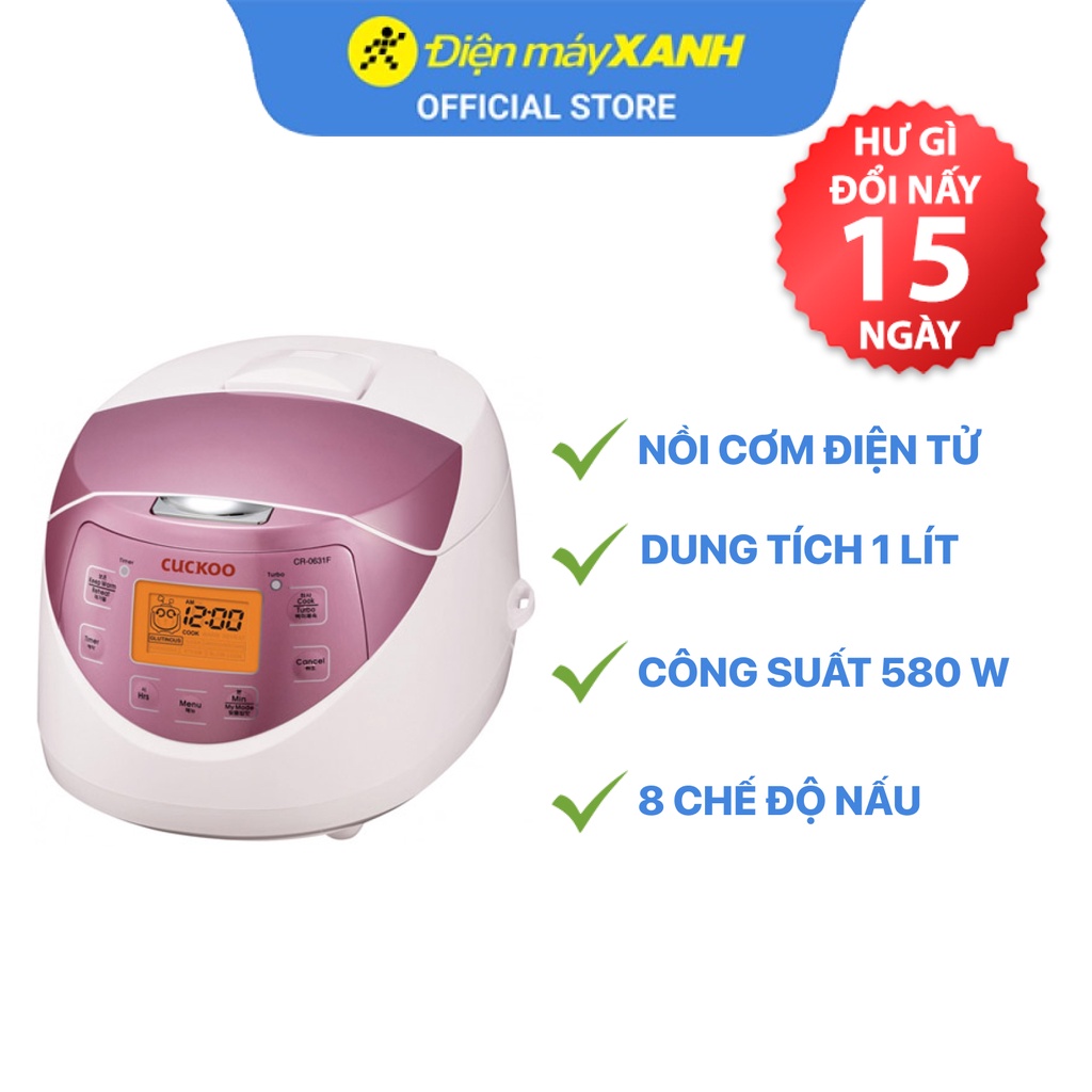 Thiết Bị Điện Gia Dụng > Đồ gia dụng nhà bếp > Nồi cơm điện || Nồi cơm điện tử Cuckoo CR- 0631F 1 lít 580 W lòng nồi chống dính - Chính hãng BH 24 tháng - Sản xuất tại Hàn QuốcCòn hàng