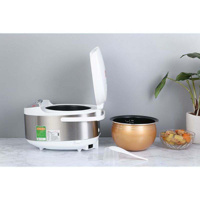 Nồi cơm hoạt động với công suất 900W, nấu chín cơm cực nhanh, giúp gia đình bạn tiết kiệm được thời gian nấu nướng. Lòng nồi có dung tích 1.8L, phù hợp với gia đình từ 4-6 người, lòng nồi được tráng men chống dính đặc biệt, giúp cơm ngon hơn và việc chùi rửa nồi cực nhẹ nhàng.