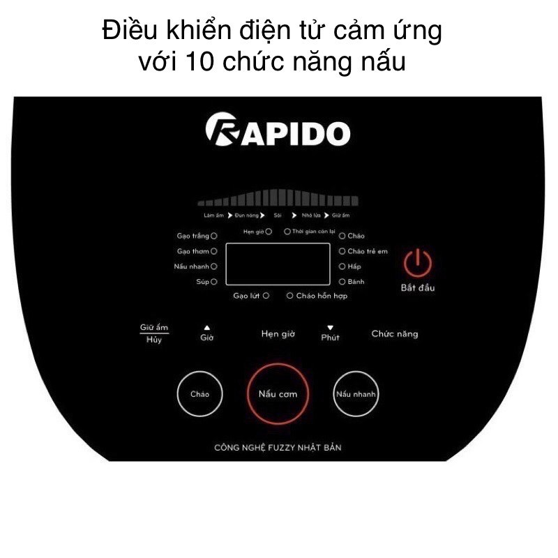 Nồi cơm điện tử Rapido RC-1.2D sở hữu bảng điều khiển điện tử với 10 chức năng nấu được ghi chú rõ ràng bằng tiếng Việt, cảm ứng cực kì tiện lợi cho người sử dụng. Các chức năng nấu từ món đơn giản đến món yêu cầu thời gian và kĩ thuật cao bao gồm: nấu gạo trắng, gạo thơm, nấu nhanh, nấu gạo lứt, nấu cháo, cháo trẻ em, cháo hỗn hợp, hấp, làm bánh. Nồi cơm điện tử Rapido còn có thể hẹn giờ nấu lên tới 24h, tạo sự linh động hơn trong nấu ăn.