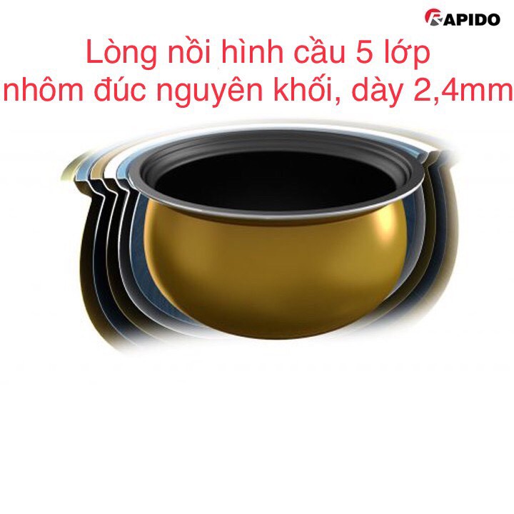 Lòng nồi cơm điện tử Rapido được tạo thành từ hợp kim nhôm đúc nguyên khối với độ dày 2.4mm (gấp đôi nồi thông thường), giúp giữ nhiệt cực tốt. Bên trong nồi phủ 2 lớp chống dính cao cấp, an toàn cho sức khỏe, giúp việc làm sạch nhanh chóng hơn. Ngoài ra, lòng nồi có dạng cầu cũng làm tăng diện tích tiếp xúc với mâm nhiệt hơn.