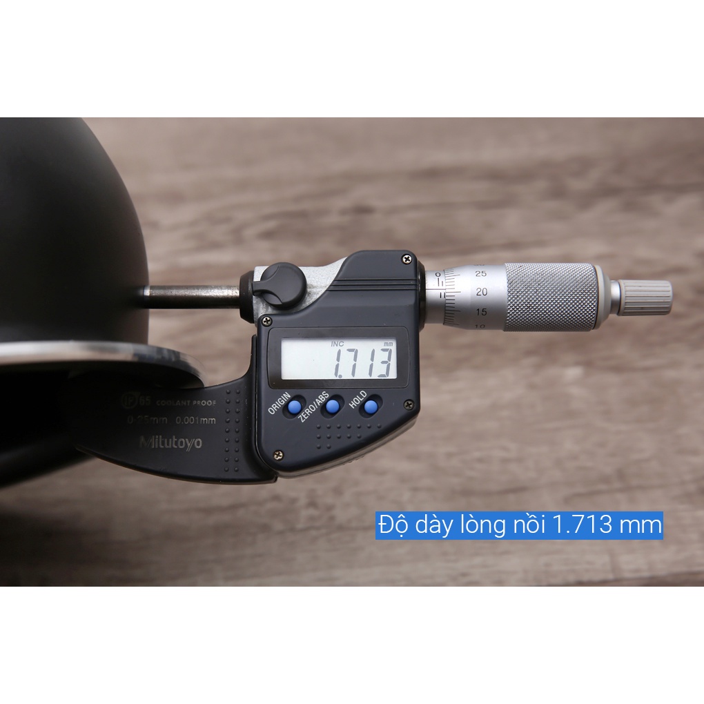 ●Lòng nồi dạng niêu, dày 1.713 mm bằng hợp kim nhôm phủ chống dính Daikin hạn chế cháy dính, méo móp do va chạm và giữ ấm lâu
