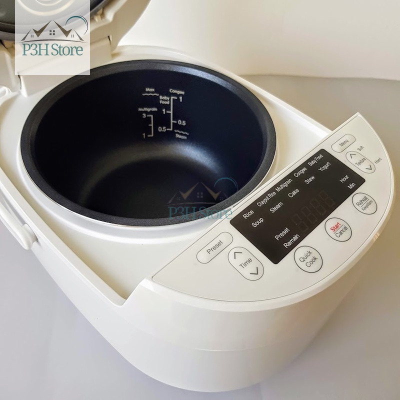 - Nồi trang bị bảng điều khiển điện tử kết hợp màn hình LED có nhiều chức năng nấu như: nấu cơm, nấu cháo, hấp, hâm nóng, nấu ăn nhanh, nấu chậm, làm bánh… và hẹn giờ nấu tiện lợi.