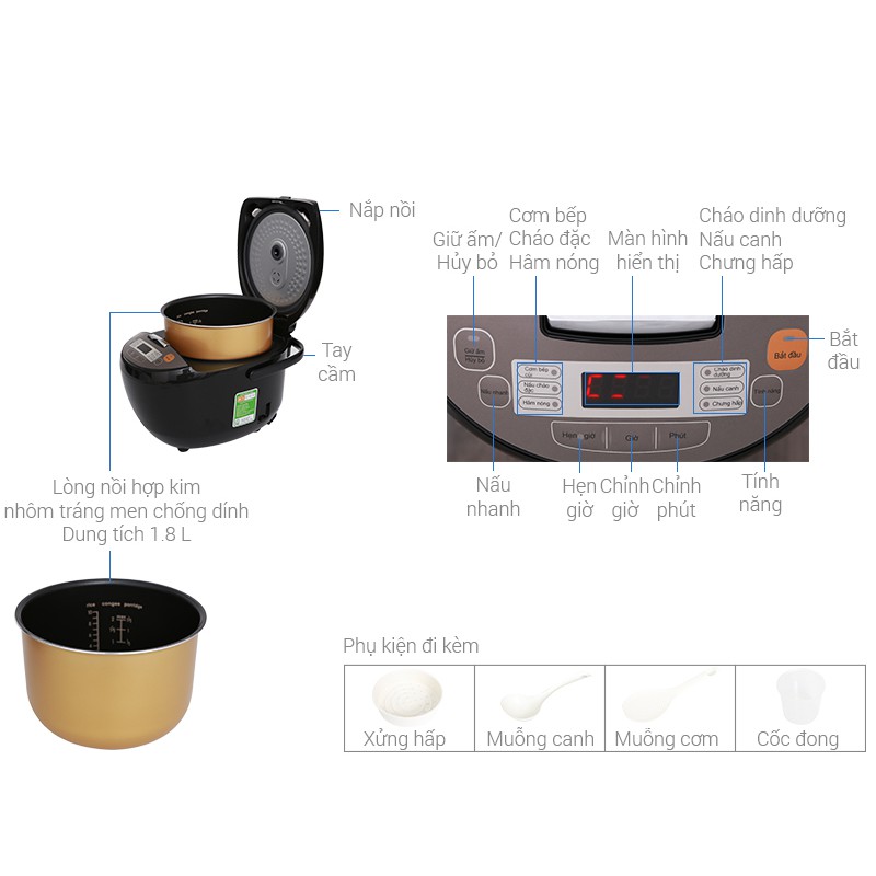 - Nồi cơm điện với bảng điều khiển điện tử hiện đại, dễ thao tác, có màn hình hiển thị tiện quan sát, mọi người dùng đều có thể thao tác chuẩn xác. Đa chức năng: nấu cơm, hâm nóng, nấu cháo, soup hỗ trợ tốt cho người nội trợ gia đình