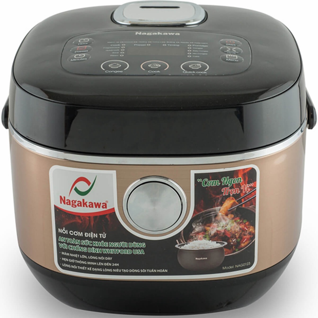 Nồi cơm điện tử Nagakawa NAG0123 có 10 chức năng nấu: Nấu nhanh, Luộc, Nấu cháo, Nấu súp, Nấu cơm, Làm bánh, Hấp, Nấu cơm trộn. Hệ thống kiểm soát điện tử đảm bảo chính xác thời gian và nhiệt độ giúp cơm chín tận lõi hạt, bảo toàn hương vị và dưỡng chất với nhiều món ăn thơm ngon đảm bảo sức khỏe.
