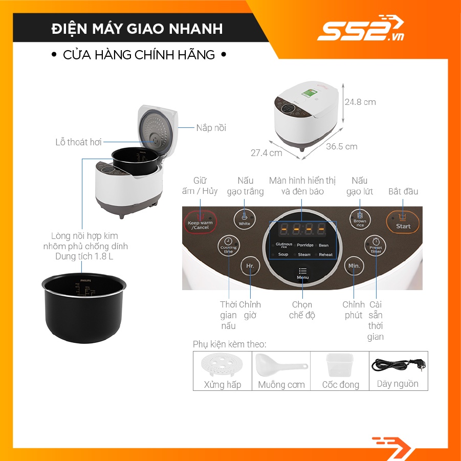 Nồi cơm điện tử Philips 1.8 lít HD4515 - Cam Kết Chính Hãng 100%THÔNG SỐ KỸ THUẬT