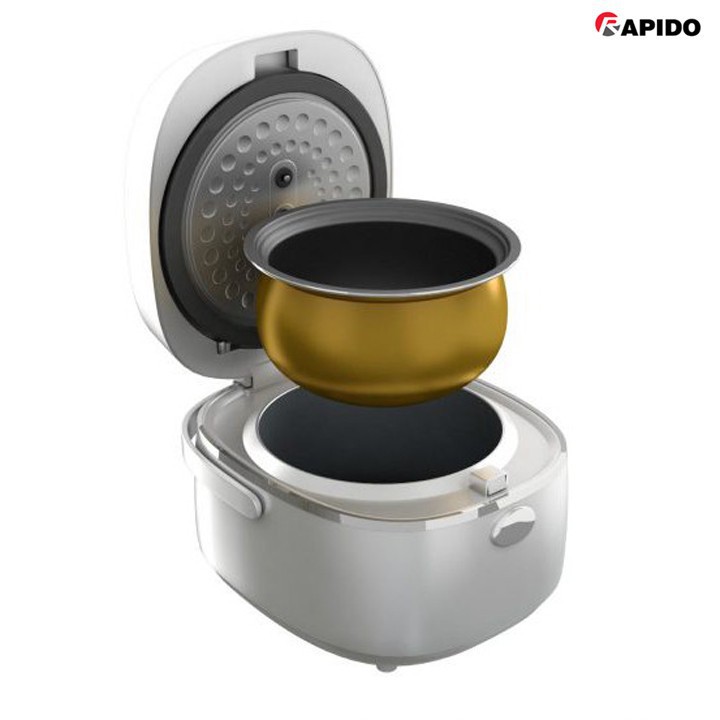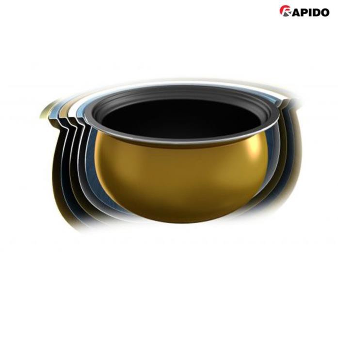 Lòng nồi cơm điện tử Rapido được tạo thành từ hợp kim nhôm đúc nguyên khối với độ dày 2.4mm (gấp đôi nồi thông thường), giúp giữ nhiệt cực tốt. Bên trong nồi phủ 2 lớp chống dính cao cấp, an toàn cho sức khỏe, giúp việc làm sạch nhanh chóng hơn. Ngoài ra, lòng nồi có dạng cầu cũng làm tăng diện tích tiếp xúc với mâm nhiệt hơn.