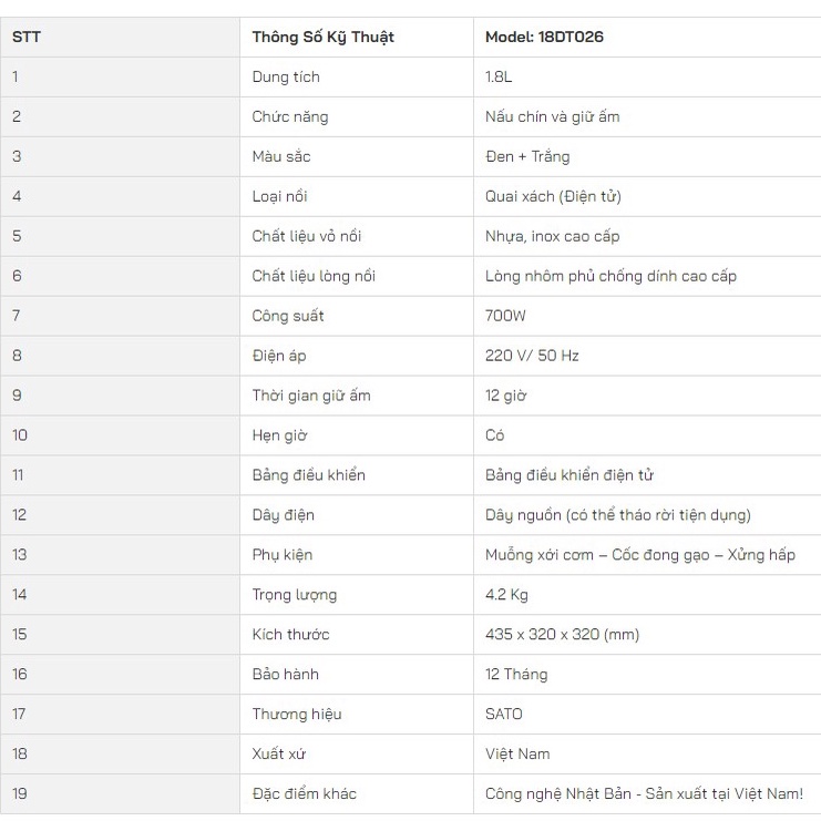 Nồi cơm điện tử Sato 18DT021 dung tích 1.8L công suất 700W - Nồi cơm điện phong cách Nhật Bản, công nghệ đến từ Nhật Bản