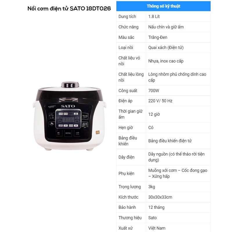 Nồi cơm điện tử sato 18DT026 dung tích 1.8L👉 THÔNG SỐ KỸ THUẬT