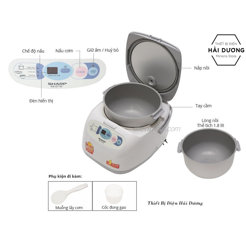 Nồi cơm điện Sharp KS-ZT18 có kiểu dáng sang trọng, màu trắng trang nhãDung tích 1.8 lít, nấu được 10 lon gạo