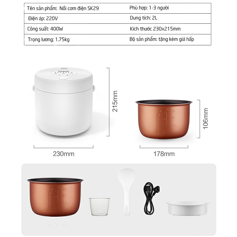 Nồi Cơm Điện Tử SK- 29 Nồi Cơm Điện Mini Dung Tích 2l Công Suất 400W Có Chế Độ Hẹn Giờ