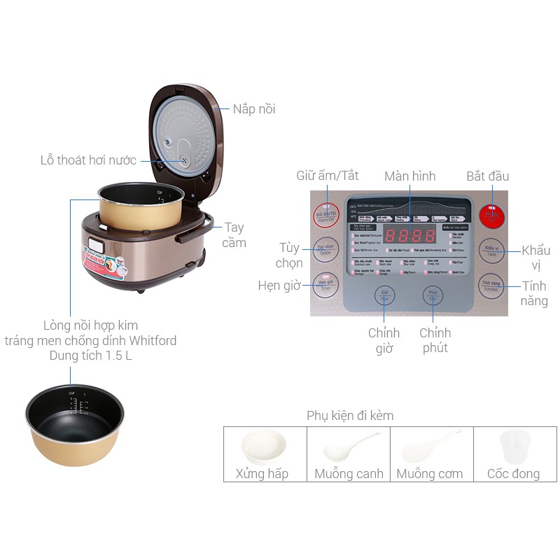 Tiện ích:Có xửng hấp, Hẹn giờ nấu xong, Đồng hồ hiển thị giờ