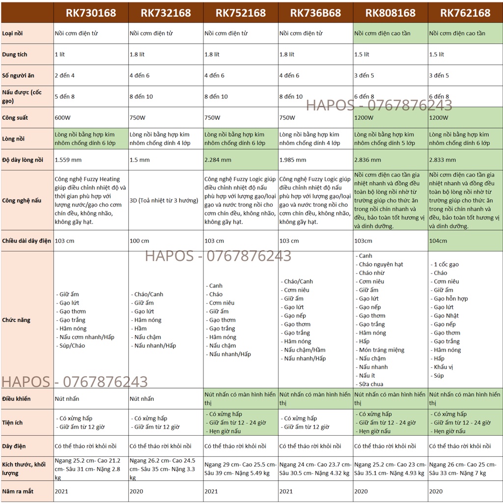 - Chức năng: Canh, Cháo, Giữ ấm, Gạo lứt, Gạo thơm, Hâm nóng, Hấp, Hầm, Nấu chậm, Nấu nhanh