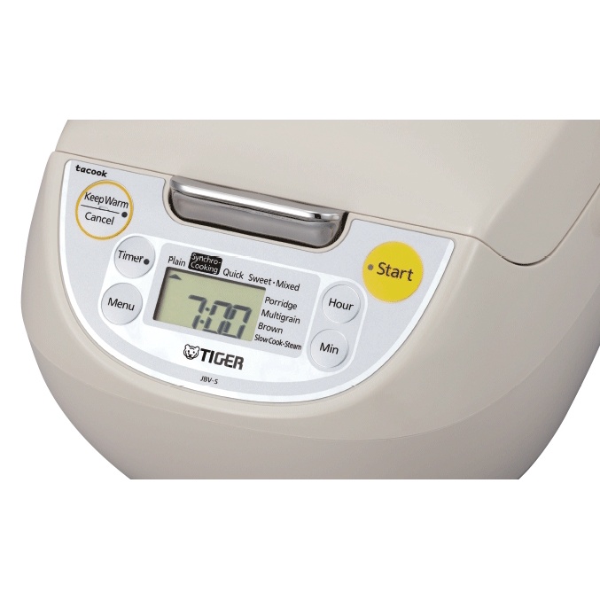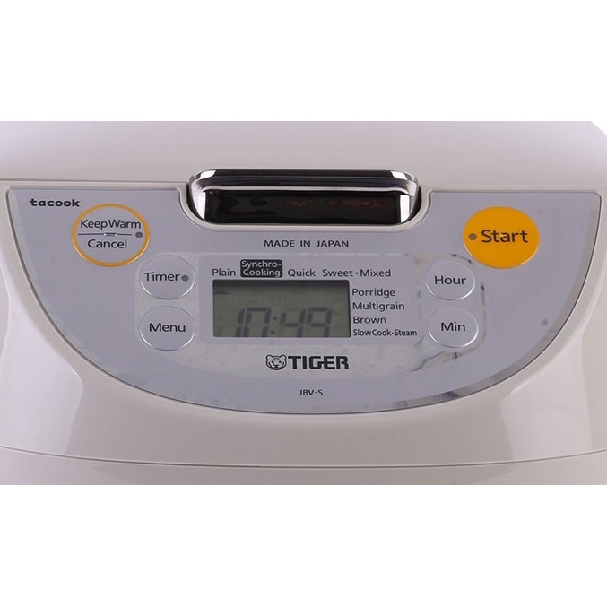 💛 Nồi cơm điện tử Tiger 4 trong 1 JBV-S10W (1.0L)✅ Nồi cơm điện tử hiệu Tiger 4 trong 1 với 9 chế độ nấu, lòng tráng men chống dính bằng tia hồng ngoại dầy 1.7mm với thiết kế 3 vòng nhiệt giúp cơm chín nhanh hơn mà hạt cơm không bị nát và không bị khô trong quá trình giữ ấm cơm, với chế độ nấu “Tacook” được tích hợp để vừa nấu cơm và vừa nấu thức ăn cùng một lúc giúp tiết kiệm thời gian, màn hình LCD, 2 chế độ hẹn giờ nấu, có quai xách, chức năng giữ ấm cơm đến 12h, ngăn cắm muỗng, cốc đong gạo, muỗng xới cơm, muỗng múc cháo/soup, khay nấu đồng thời, sách hướng dẫn các thực đơn nấu ăn kèm theo sản phẩm, màu cà phê sữa.
