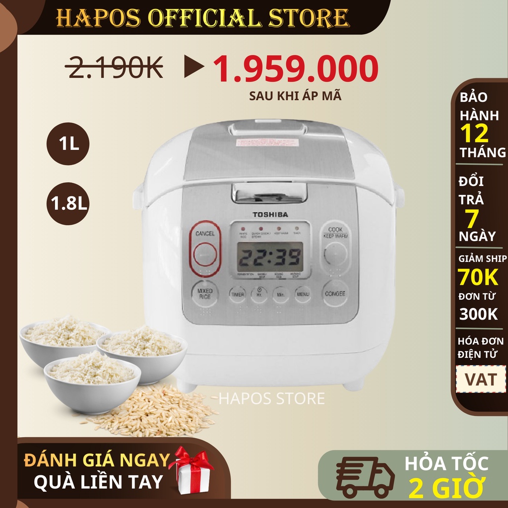 Nồi cơm điện tử Toshiba 1 lít - 1.8 lít hợp kim nhôm chống dính 800W giữ ấm đến 30 giờ - HAPOS phân phối chính hãng