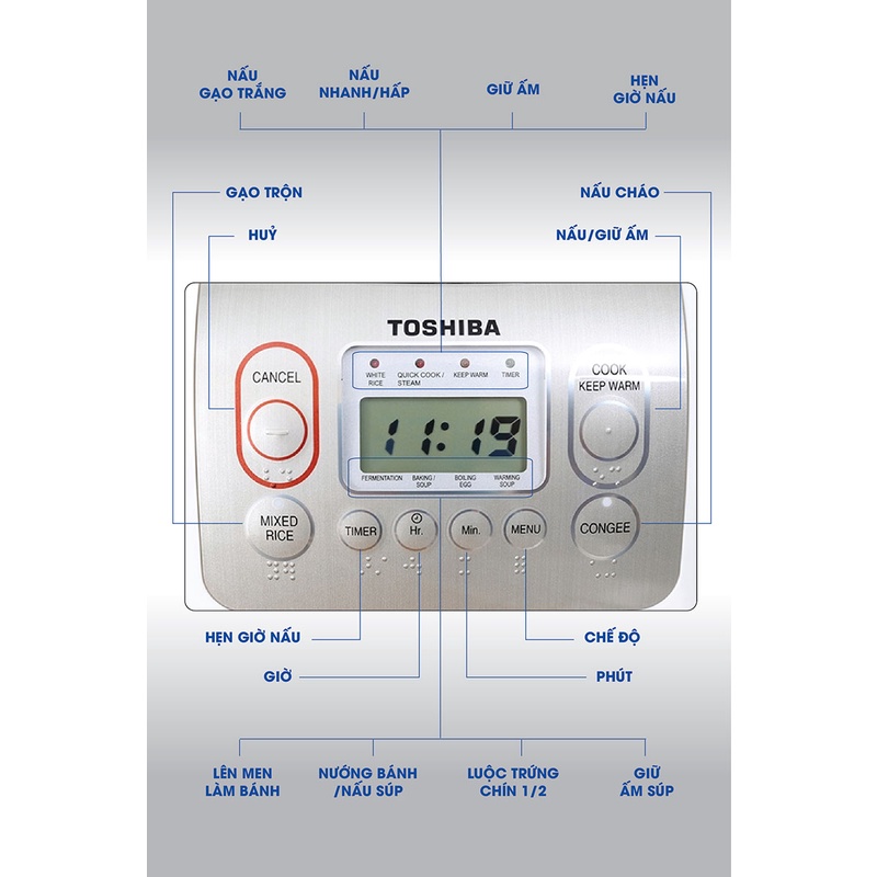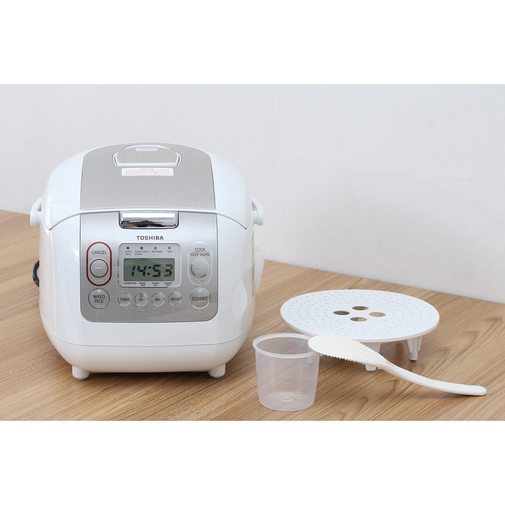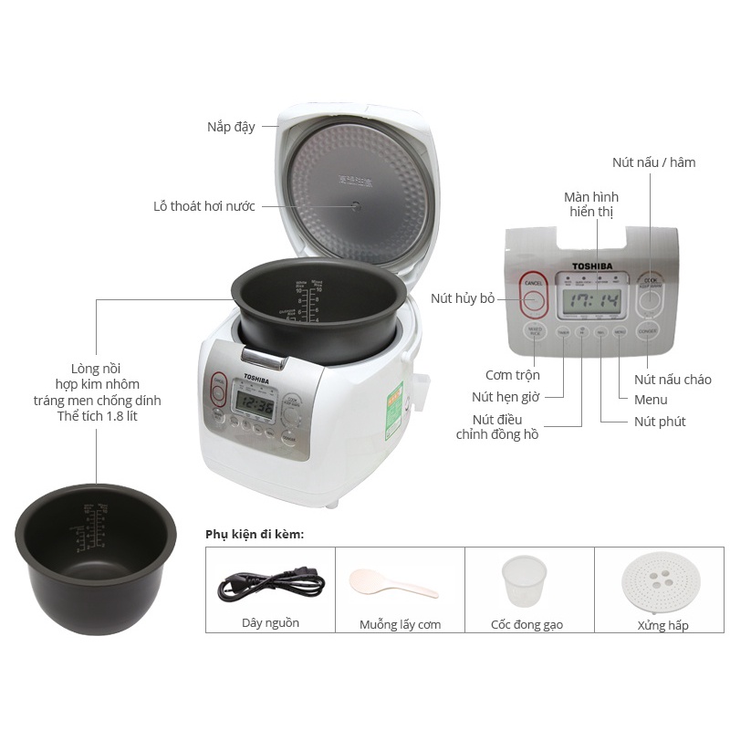 - Nồi cơm điện tử hiệu Toshiba với 8 chế độ nấu, lồng tráng men Luorocarbon Polymer chống dính dầy 4.0mm với công nghệ nhiệt đa chiều 360º giúp cơm chín nhanh hơn mà hạt cơm không bị nát và không bị khô trong quá trình giữ ấm cơm, màn hình LCD, 2 chế độ hẹn giờ nấu, có quai xách, chức năng giữ ấm cơm đến 30h, cốc đong gạo, muỗng xới cơm, ngăn cắm muỗng, vĩ hấp kèm theo sản phẩm, màu trắng viền inox.