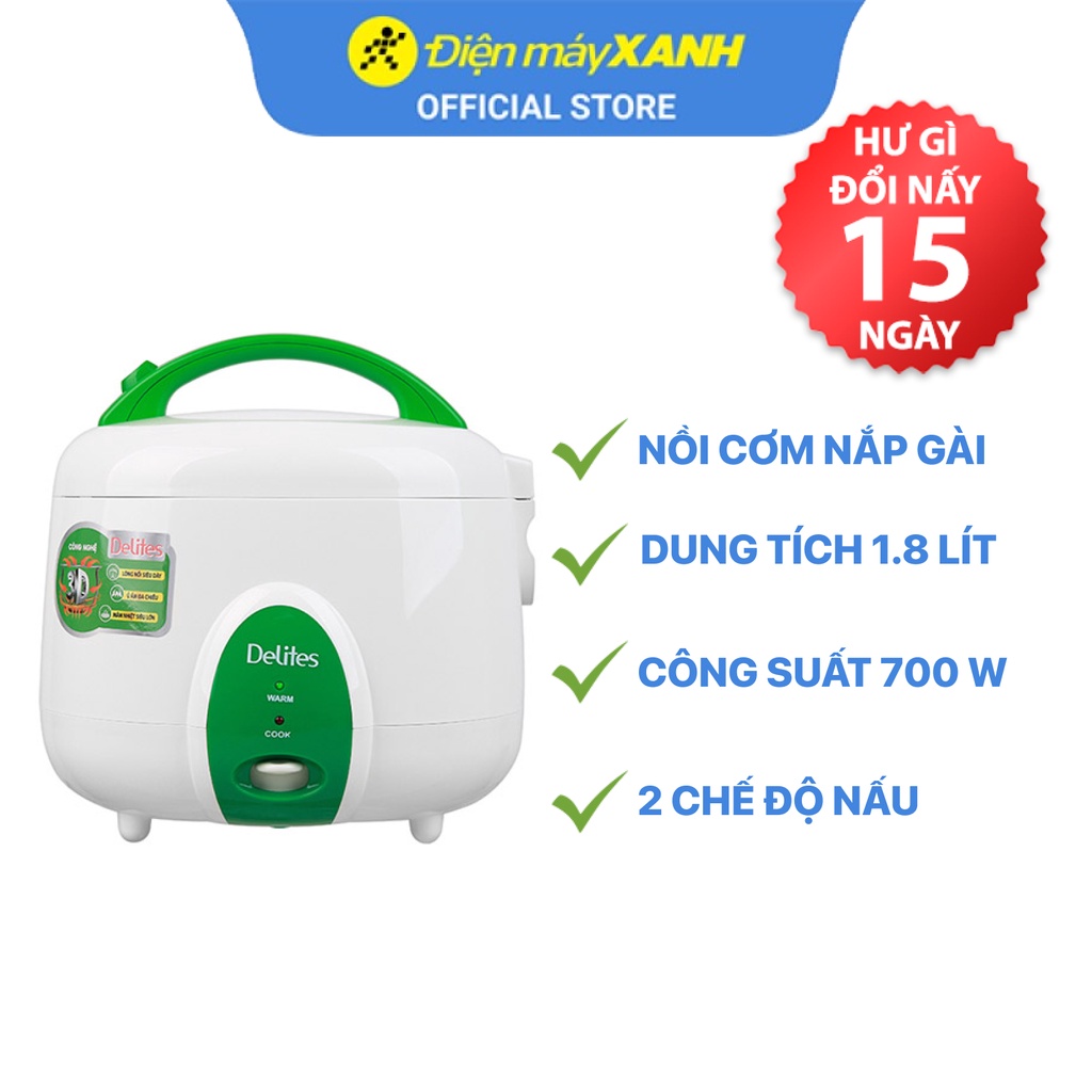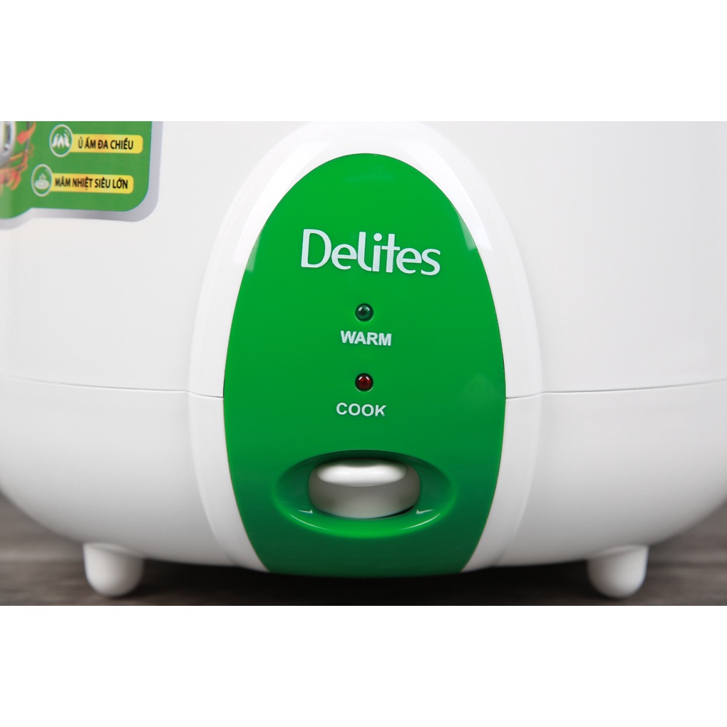 ● Nồi cơm điện Delites thiết kế hiện đại, màu trắng - xanh lá cây trẻ trung, đẹp mắt, kết cấu chắc chắn, di chuyển, nấu cơm thuận tiệnDung tích 1.8 lít phục vụ đủ cơm nóng cho gia đình 4 - 6 người sử dụng hằng ngày.