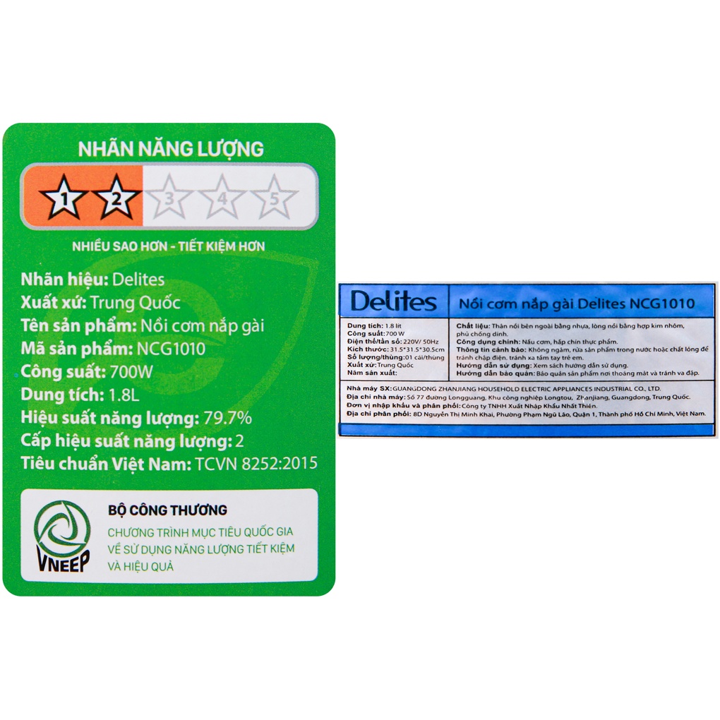 Thiết Bị Điện Gia Dụng > Đồ gia dụng nhà bếp > Nồi cơm điện || [Mã ELMALL150 giảm 8% đơn 500K] Nồi cơm nắp gài Delites 1.8 lít NCG1010Còn hàng