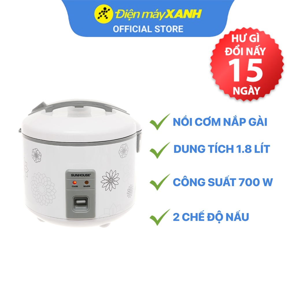 Nồi cơm nắp gài Sunhouse 1.8 lít SHD8603 của thương hiệu Sunhouse uy tín Việt Nam, sản xuất tại Việt Nam, thiết kế đẹp, sử dụng đơn giản, thương hiệu Sunhouse quen thuộc với mọi gia đình.