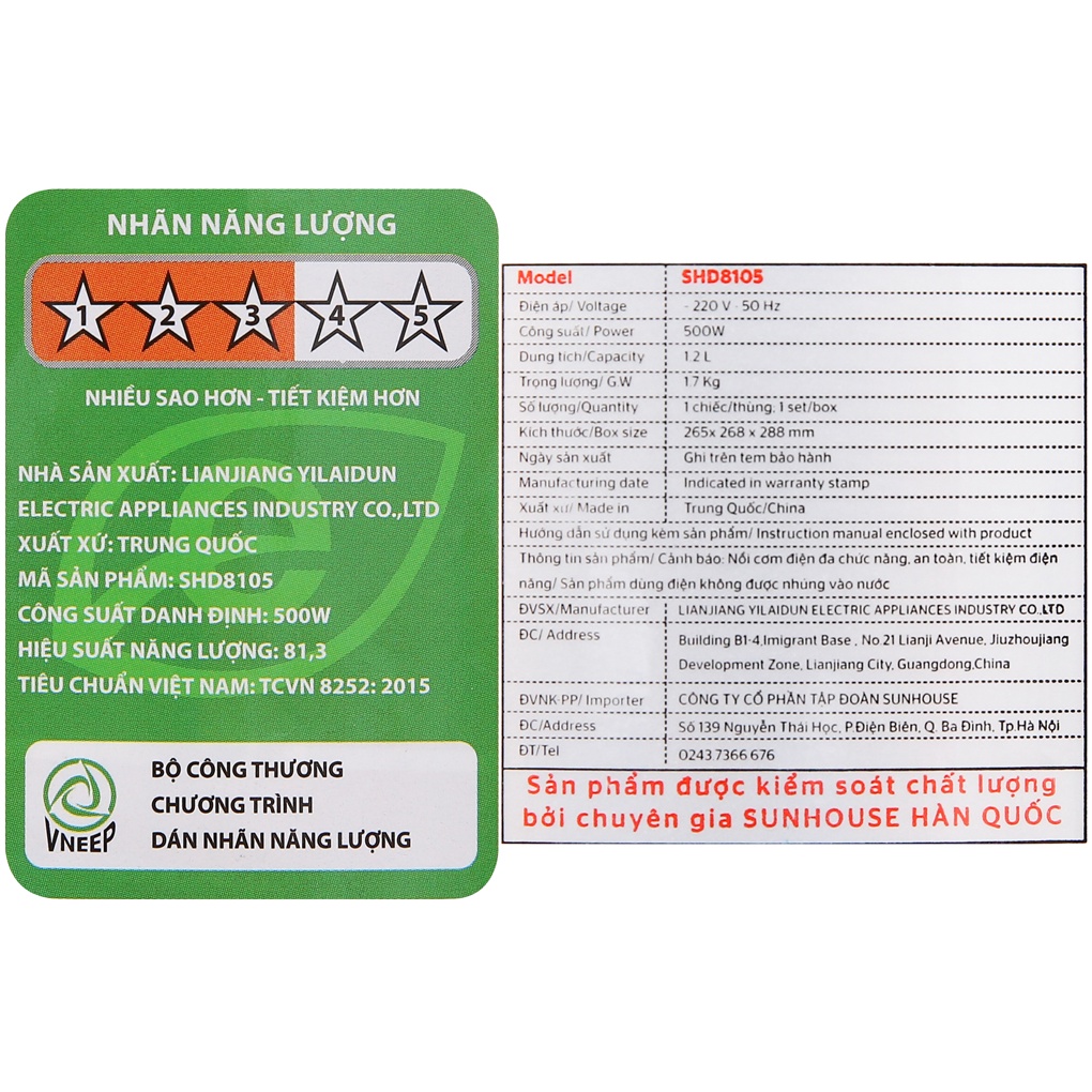 Thiết Bị Điện Gia Dụng > Đồ gia dụng nhà bếp > Nồi cơm điện || [Mã ELMALL150 giảm 8% đơn 500K] Nồi cơm nắp rời Sunhouse 1.2 lít SHD8105Còn hàng