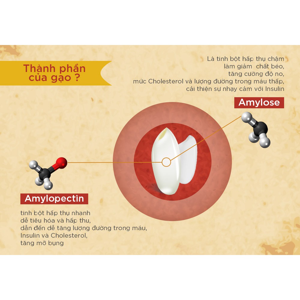 Thành phần chính của hạt gạo là tinh bột. Tinh bột chứa hỗn hợp Amylose (tinh bột hấp thụ chậm) và Amylopectin (tinh bột hấp thụ nhanh).