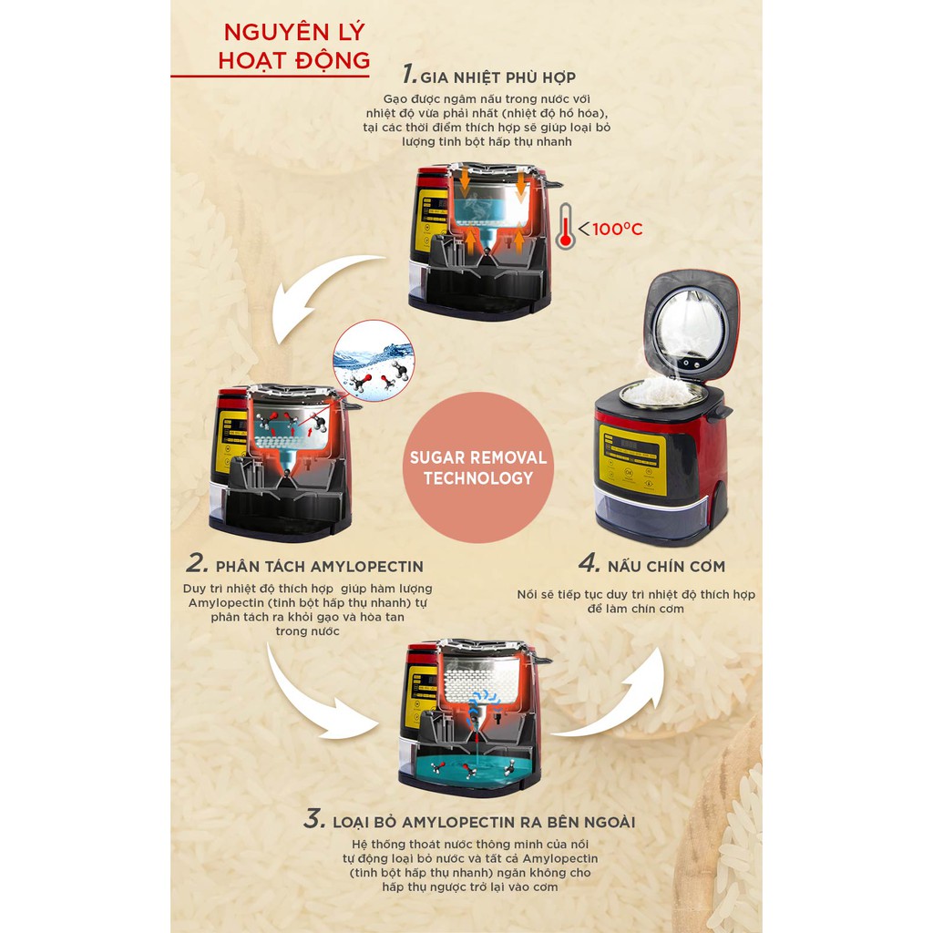 Cứu tinh thế kỷ đã xuất hiện. Nồi cơm tách đường đầu tiên xuất hiện tại Việt Nam với tính năng đặc biệt: Loại bỏ tinh bột xấu để chén cơm an toàn và ngon hơn. Không chỉ vậy, kiểu dáng và thiết kế hoàn hảo, chắc chắn sẽ làm hài lòng mọi khách hàng khó tính.