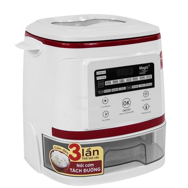Nồi cơm tách đường Magic Korea - A511 giúp loại bỏ các tinh bột xấu trong gạo, loại bỏ đường trong quá trình nấu cơm. Sản phẩm giúp hạ đường huyết với người bị tiểu đường. Ngoài ra, nồi cơm tách đường còn giúp phòng ngữa các bệnh về: tiểu đường, tai biến, tim mạch do các tinh bột xấu trong gạo gây nên.