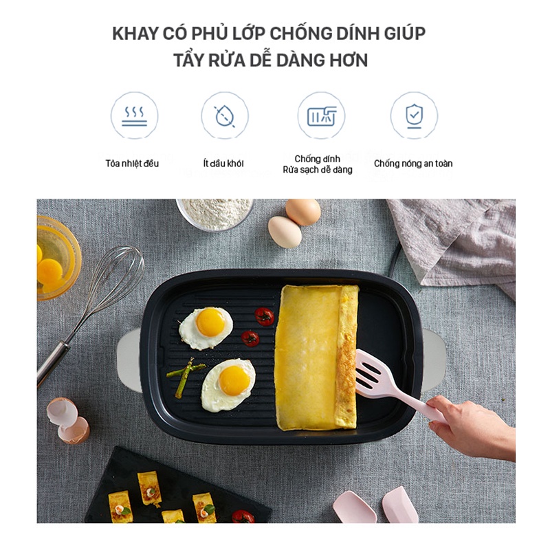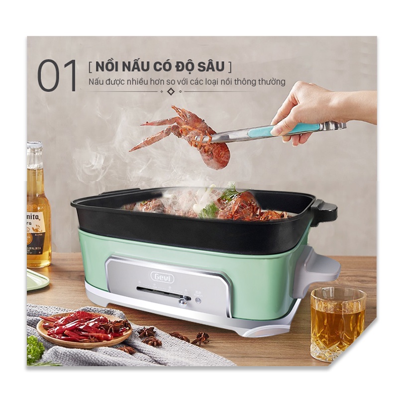 Bếp Nướng Điện, Nồi Lẩu, Hấp Đa Năng 3Lít GEVI công suất 1400W- Khay nướng chống dính - BH 12 Tháng Chính Hãng
