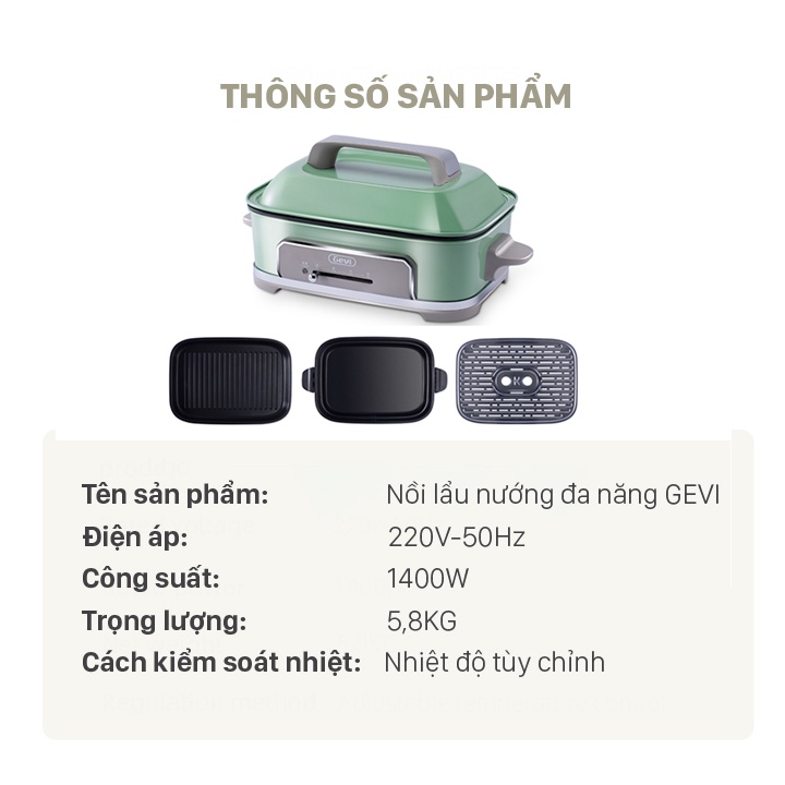 - Tích hợp nhiều chức năng nấu nướng trên cùng một chiếc bếp, bộ Nồi Lẩu Nướng Đa Năng Gevi bao gồm 1 cái bếp và 3 món thiết bị kết hợp kèm theo tương ứng với các công dụng khác nhau: