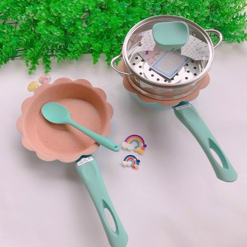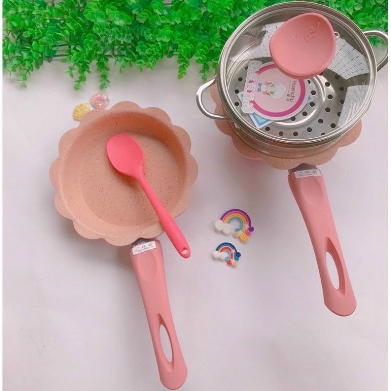 Màu hồng là nồi màianshi ( nồi dc làm bằng hợp kim nhôm tay cầm chống nóng, lòng nồi chống dính đá maifan theo phong sách nhật bản) có tặngkèm thìa của hãng